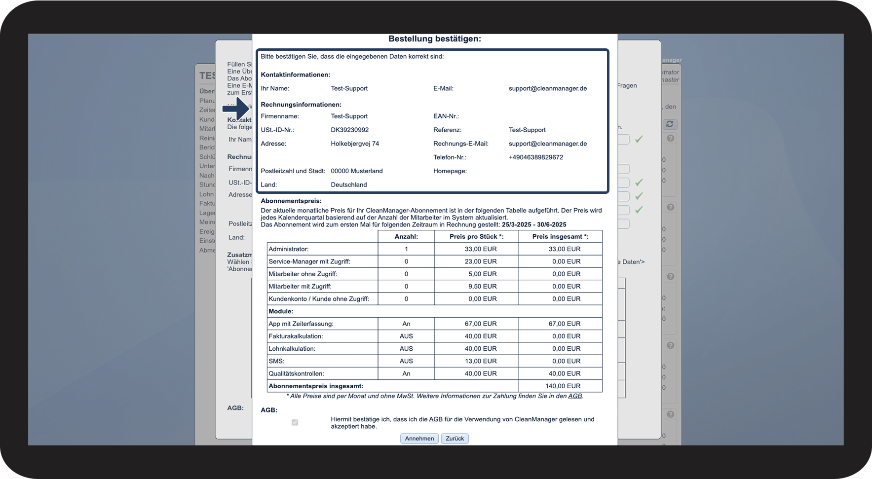 Bevor Sie ein Abonnement abschließen, haben Sie jederzeit die Möglichkeit, eine Präsentation über CleanManager zu erhalten. Mehr über diese Möglichkeit erfahren Sie hier.