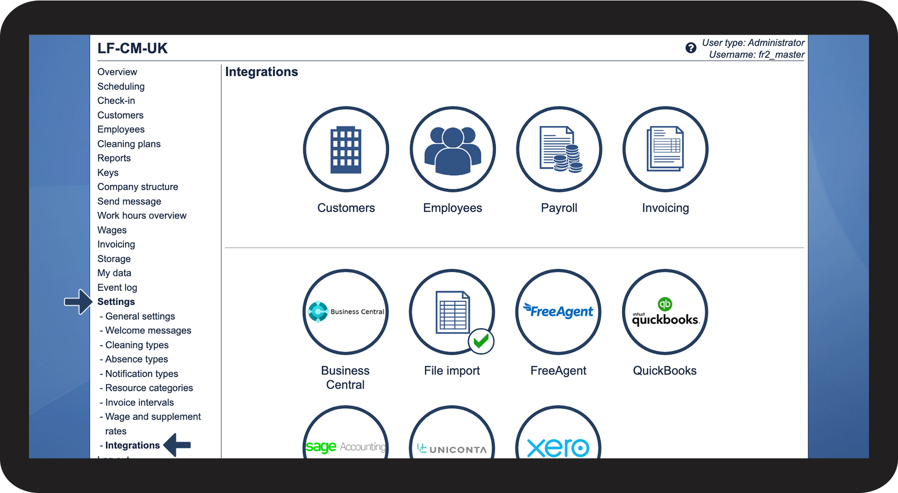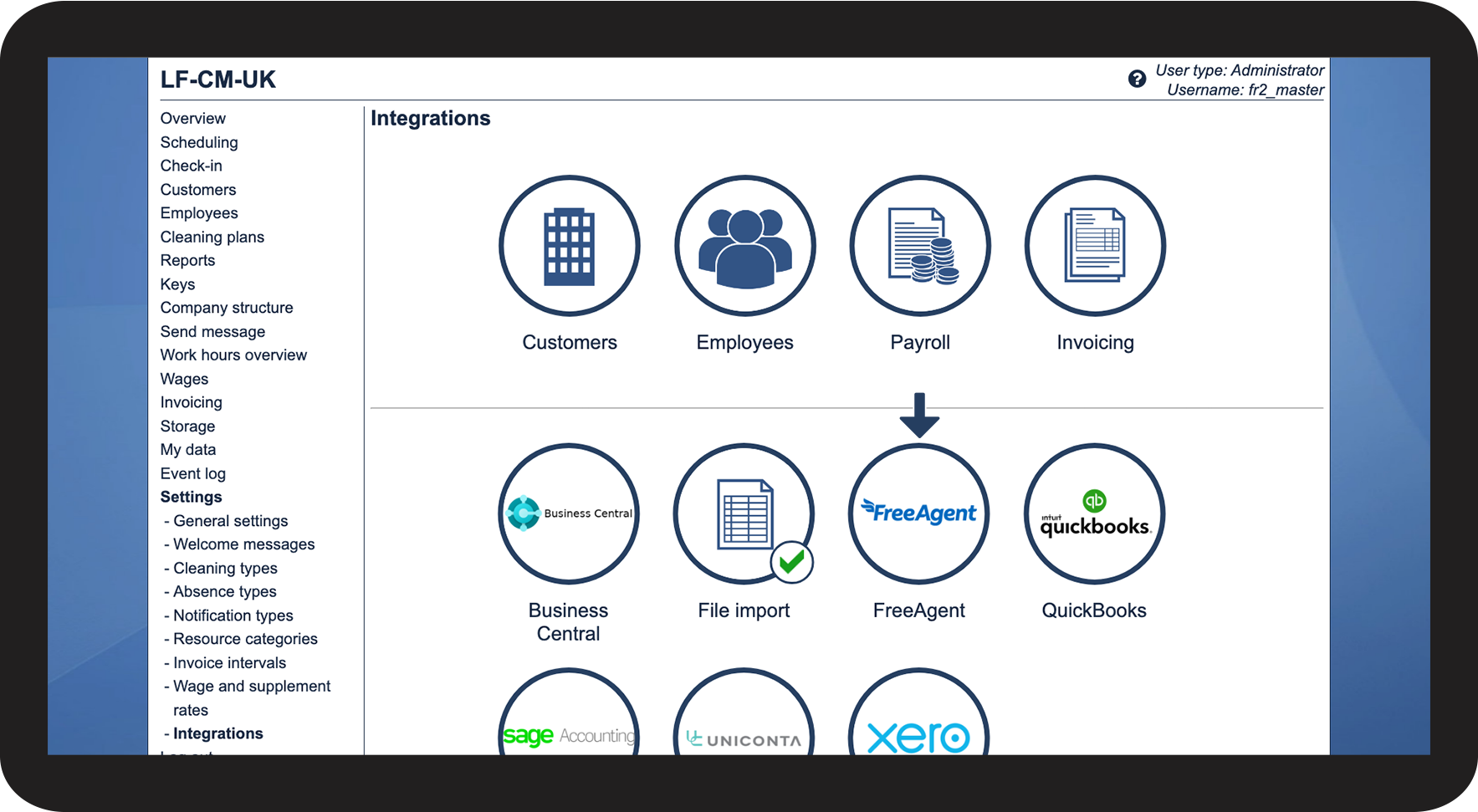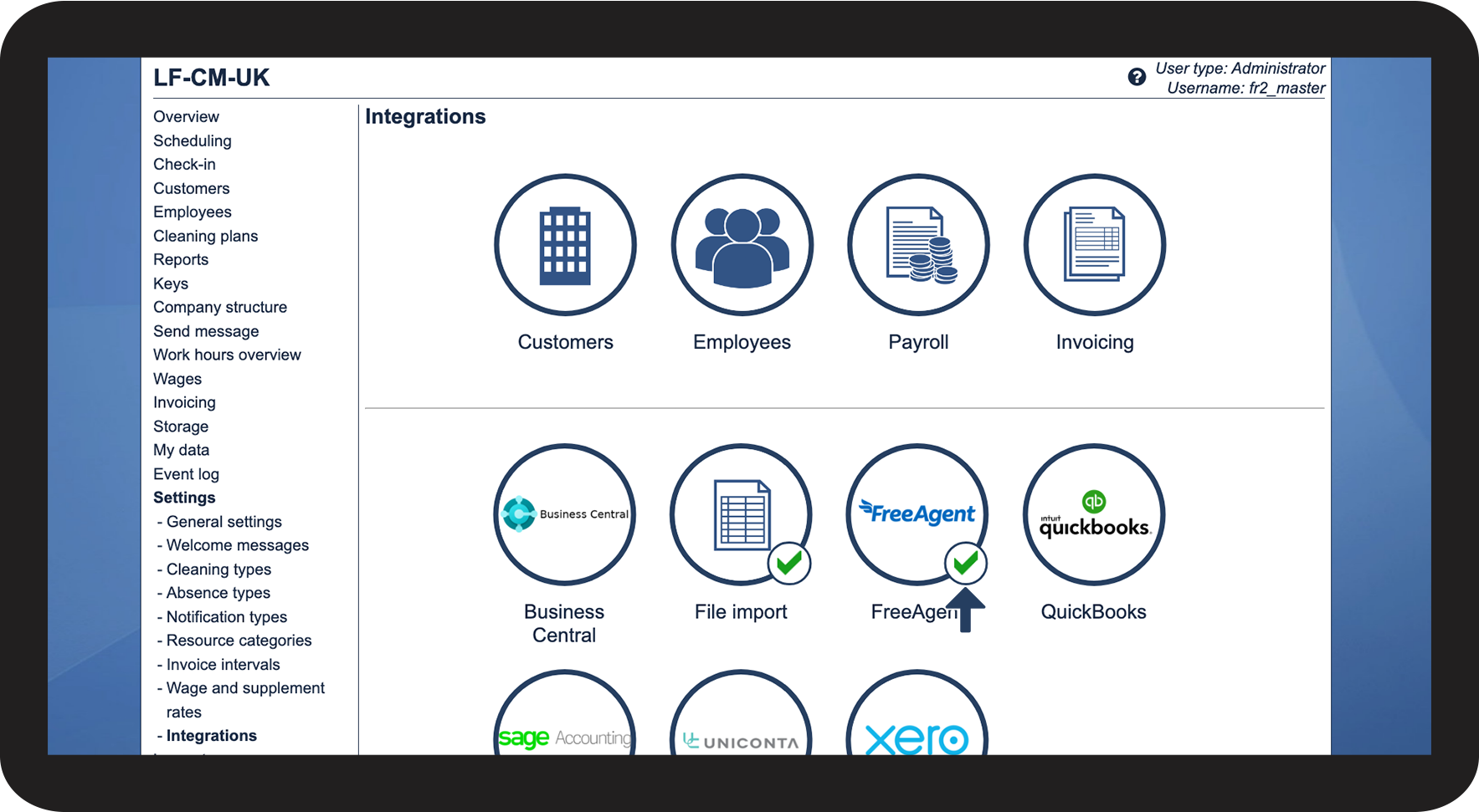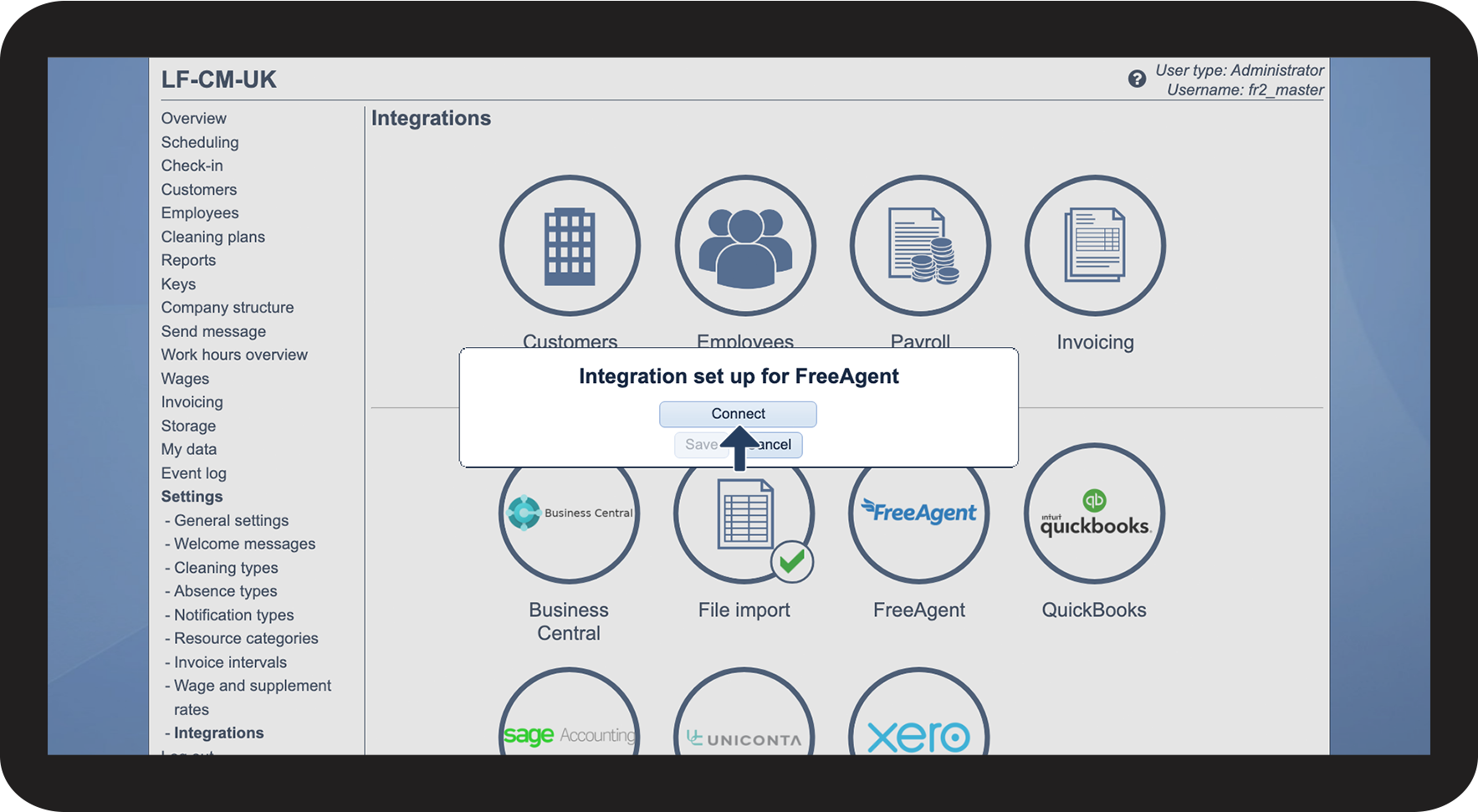 As the administrator in CleanManager, you can set up the integration with FreeAgent.