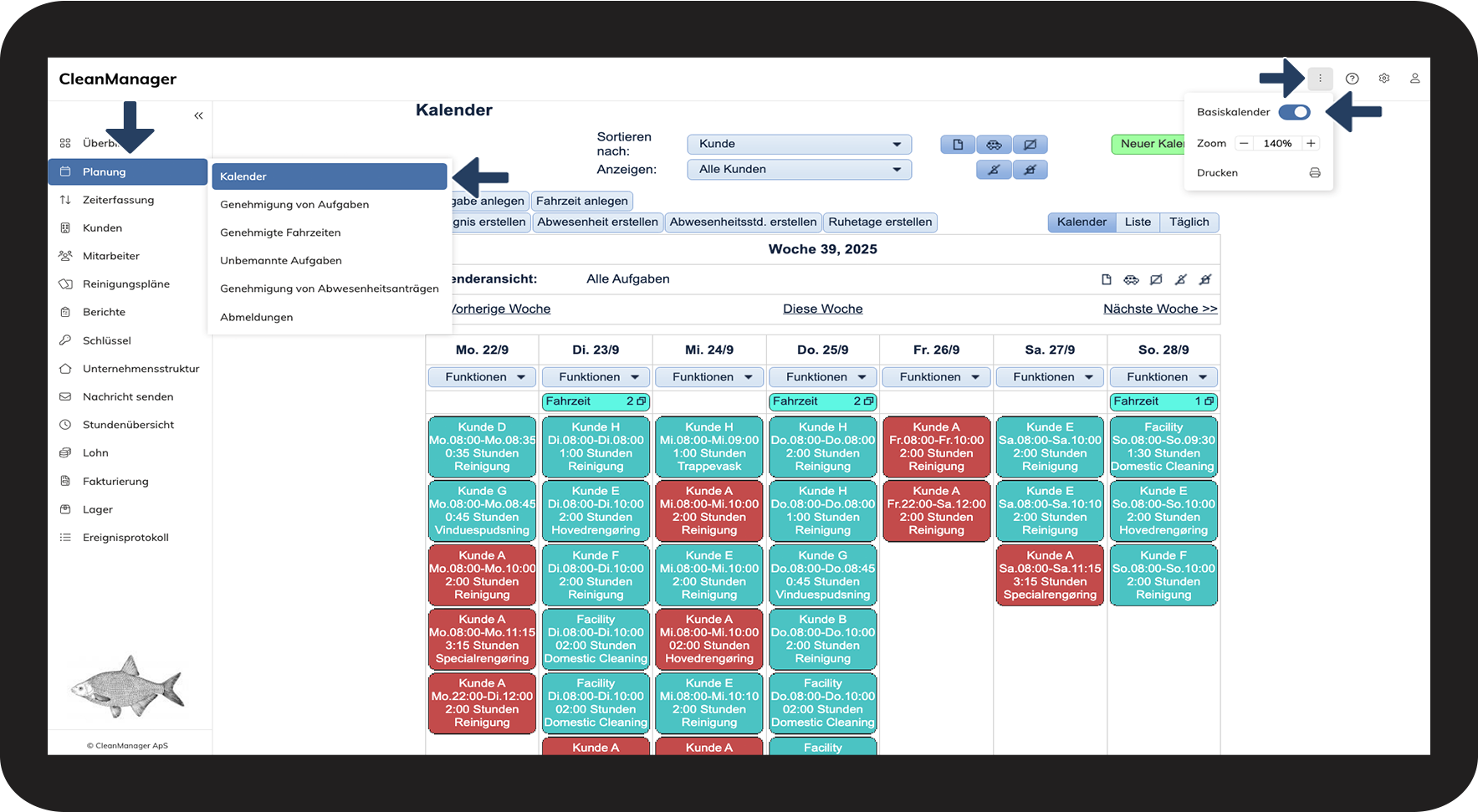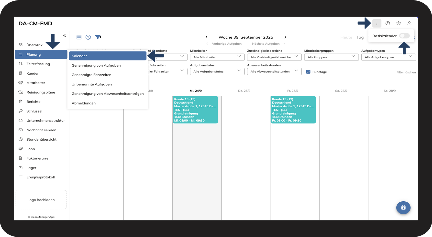 In CleanManager haben Administratoren und Service-Manager die Möglichkeit, sowohl mit dem Basiskalender als auch mit dem Kalender zu arbeiten.