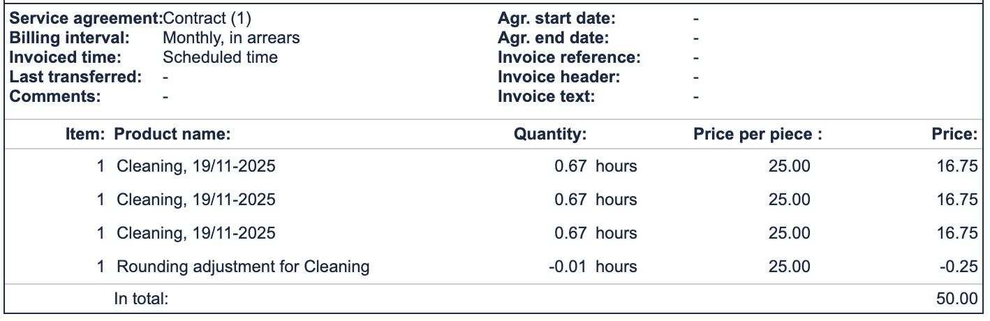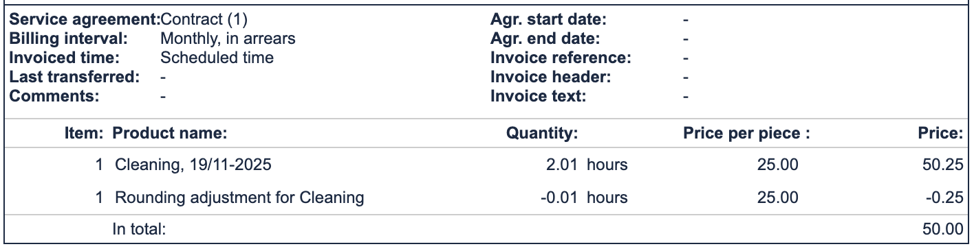 For example, if you have three tasks with the same cleaning type, they will not all be shown as 0.67 hours. Instead, the rounding is adjusted automatically so that some lines are shown as 0.66 hours, making the total exactly 2.00 hours instead of 2.01 hours.